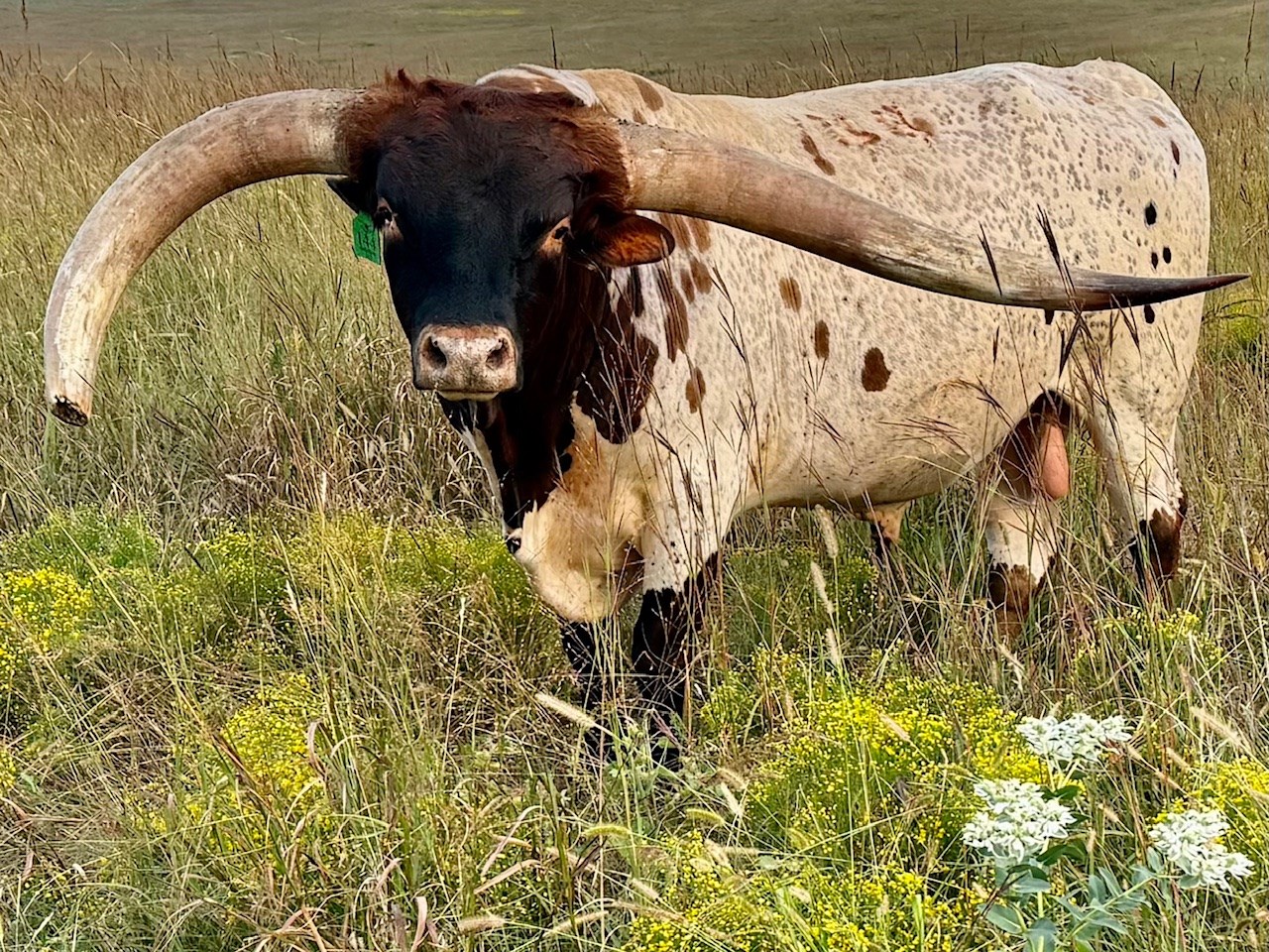 A SUPERSTAR IN THE MAKING DESPITE HIS FROZEN HORN INJURY. HIS PEDIGREE COMBINES MC HANGIN' TUFF (102'' TTT ) WITH TSUNAMIS TUFF PEARL (101'' TTT) OUR BEST FEMALE . .HIS UNDAMAGED LEFT HORN WAS 53" FROM TIP TO MIDPOLE AT 4.0Y WHICH PROJECTS TO 106.0'' TTT.. OUTSTANDING POTENTIAL AS SERVICE SIRE OUR HERD. HE HAS SIZE, HORN ,PEDIGREE AND A GENTLE DISPOSITION SO WE ANTICIPATE GREAT PRODUCTION IN 2025